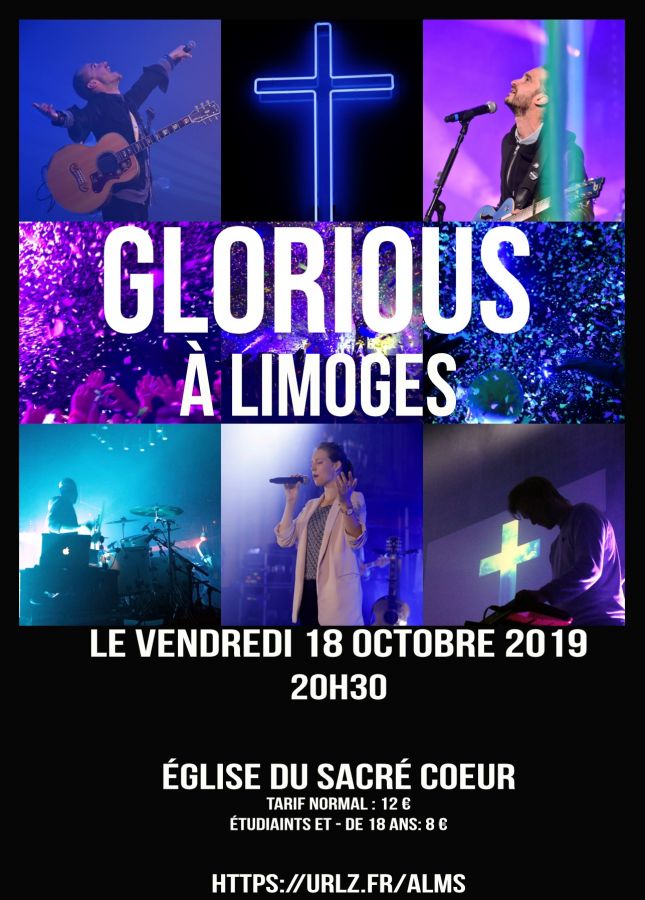 Le Groupe Glorious reviens un an après, le vendredi 18 octobre pour une soirée de Louange et de prières exceptionnelle à l'Eglise du Sacré Coeur de Limoges ! Vous y êtes tous invités. Le Seigneur vous attend et veut vous y rejoindre ! Invitez vos amis. Dieu va faire des choses extraordinaires ! Billetterie : https://www.helloasso.com/associations/association-diocesaine-de-limoges/evenements/glorious-a-limoges