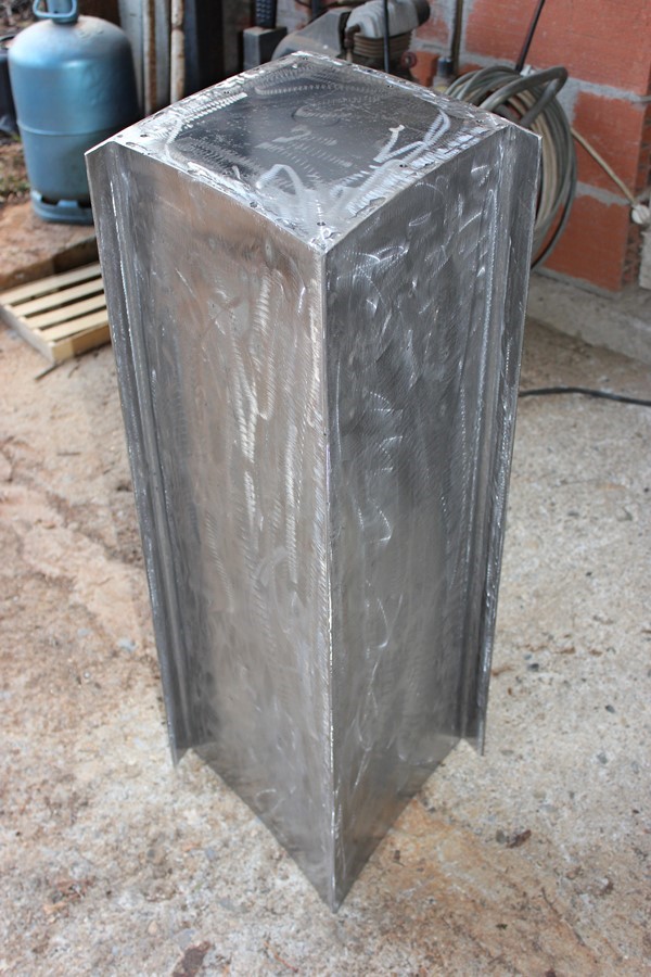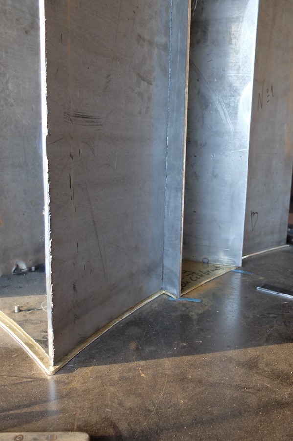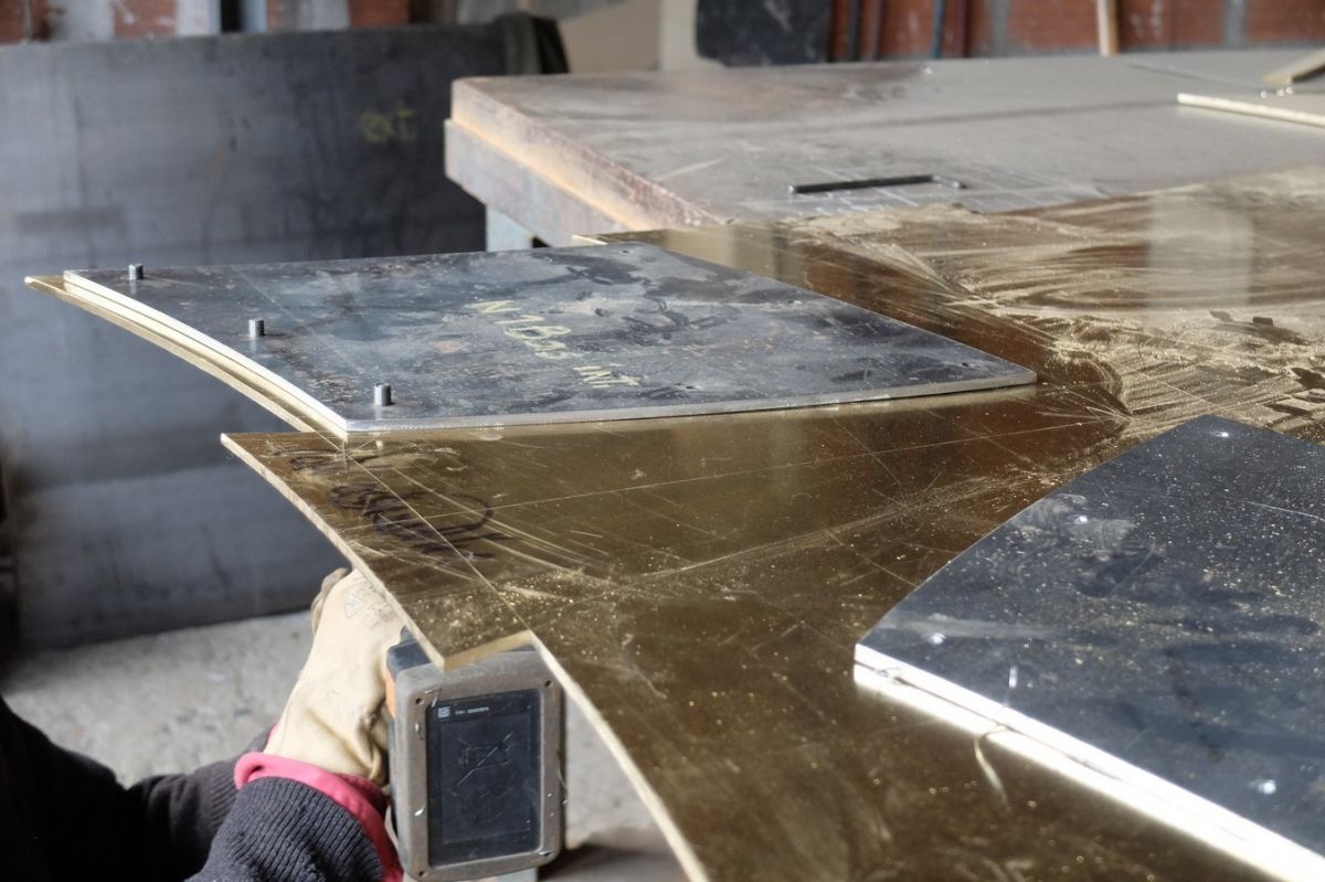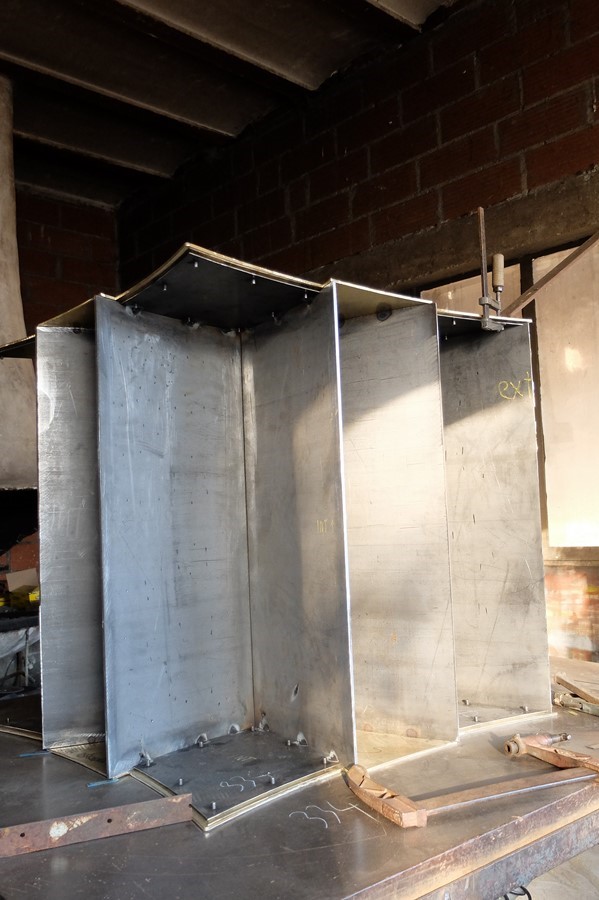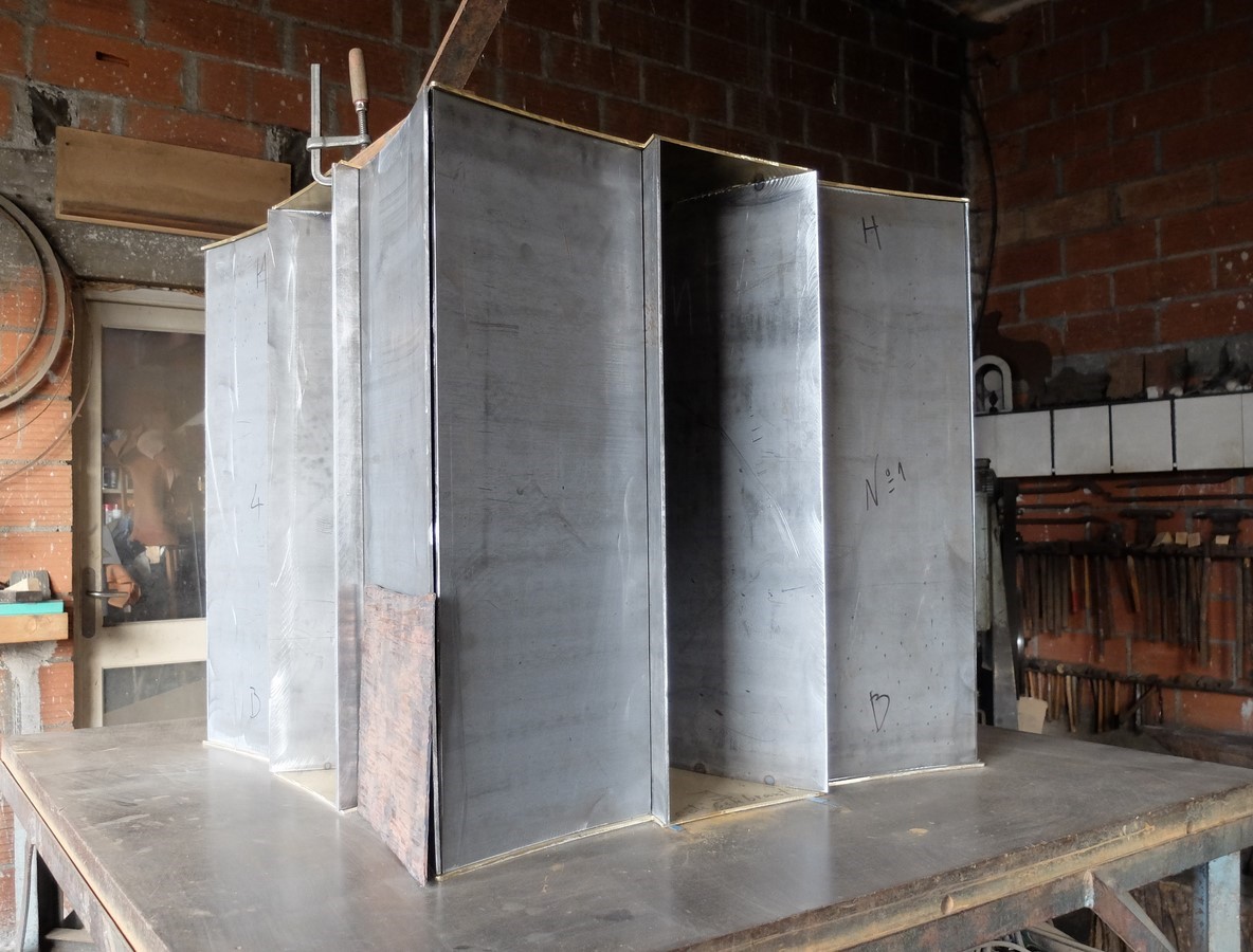 Pour recevoir le poids de la pierre une première structure est construite en acier. Les plaques de métal sont mises en forme et après fixation des fonds sur la base de laiton, photos n°1et 2,  quatre éléments en quelque sorte tubulaires, comme des piliers, sont montés simultanément (photos n° 3 à 7). Sur la photo n°8, un élément en acier est terminé.