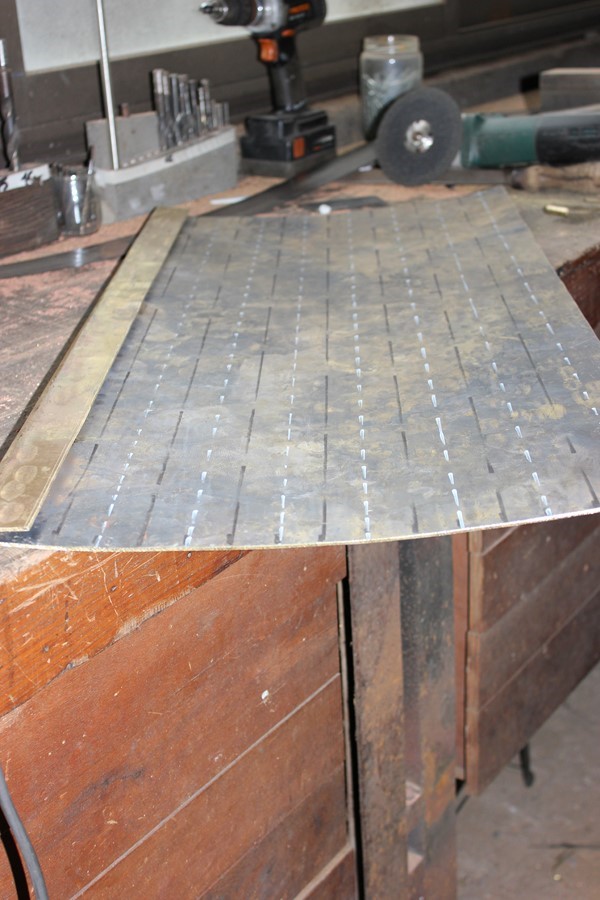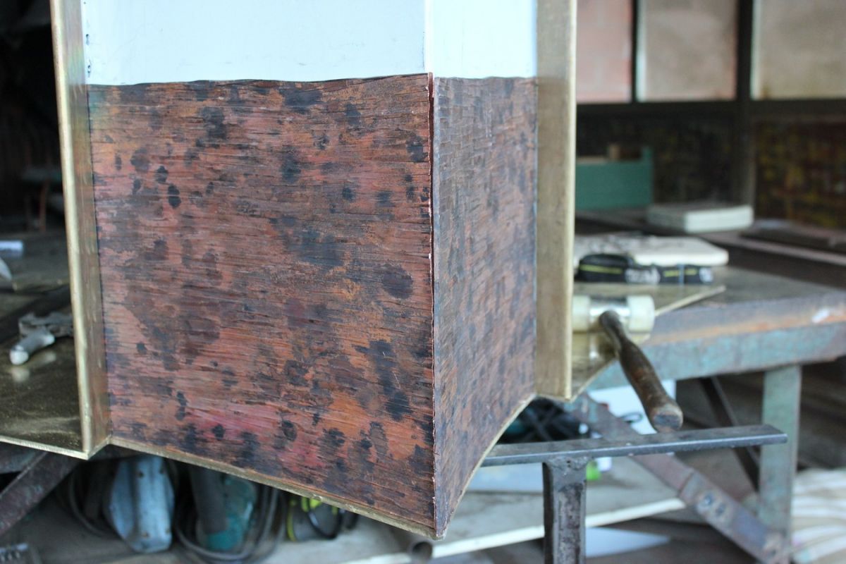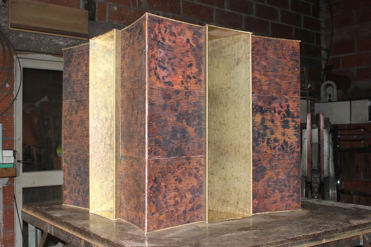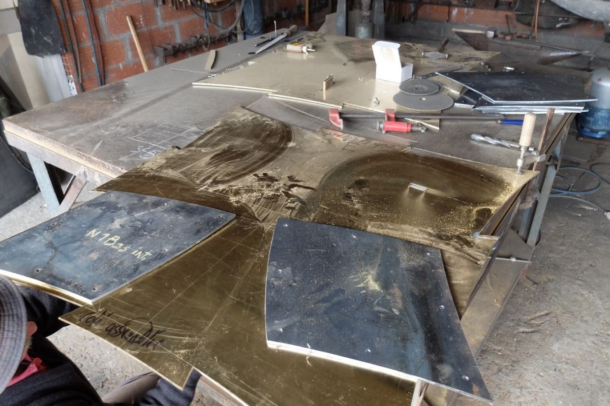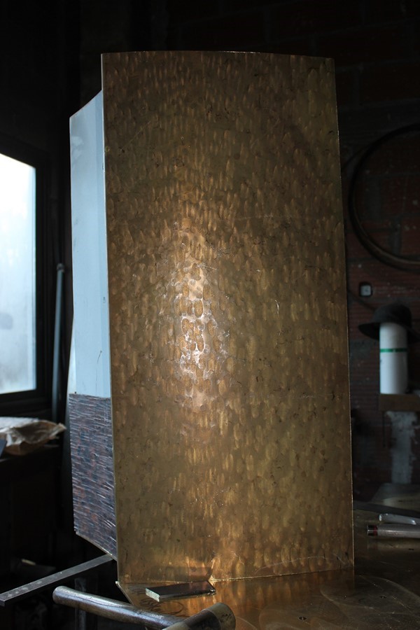 Puis, après chauffage, façonnage, martelage et mise en forme, les plaques de laiton constituant les faces intérieures du corps de l'autel sont mises en place. Ces surfaces intérieures seront dorées à la feuille. photos n°10 et 11. Travail à venir.